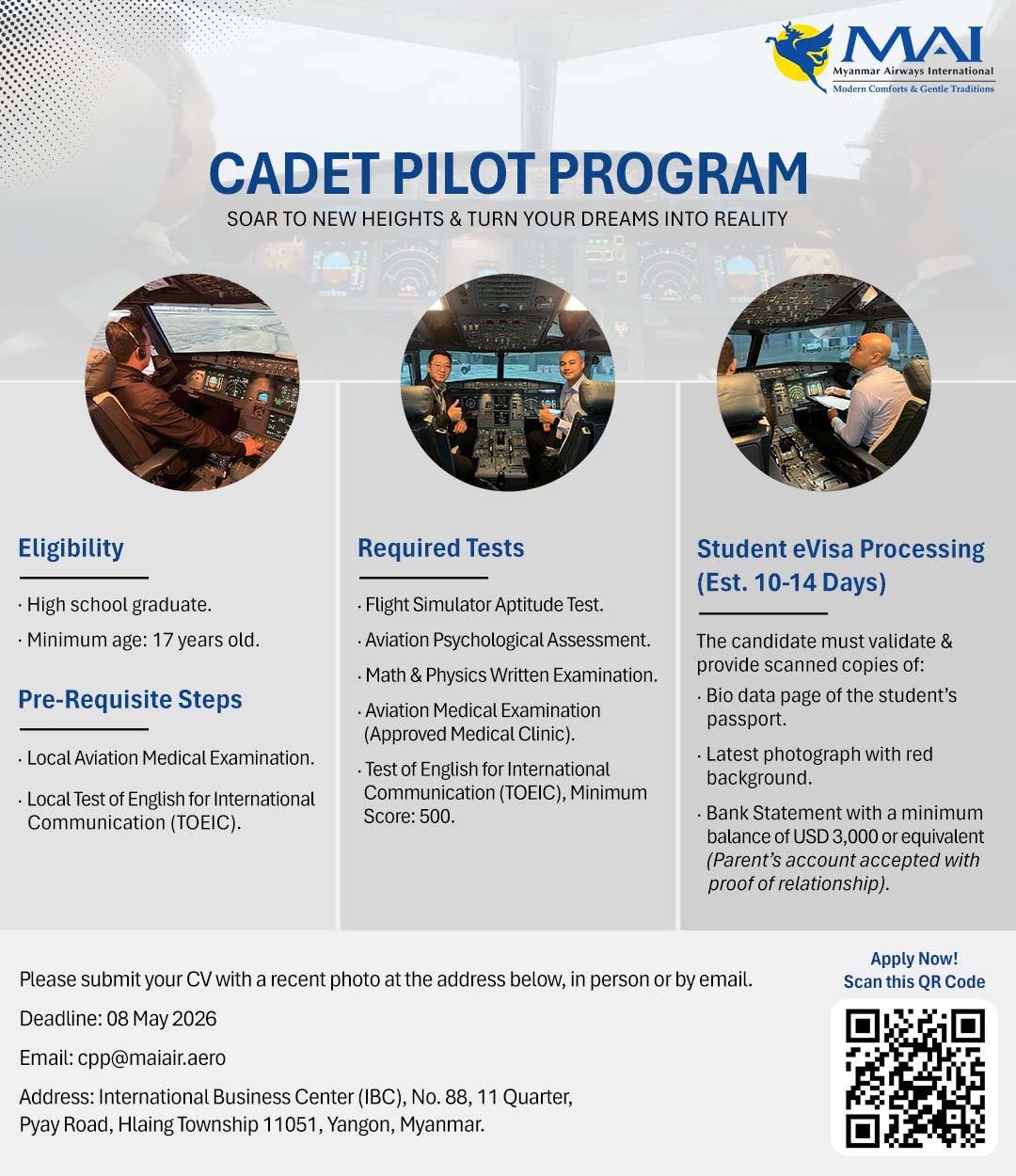 လေကြောင်းလုပ်ငန်းကို စိတ်ဝင်စားပြီး လေယာဉ်မှူးတစ်ယောက်ဖြစ်ချင်သည့် အိပ်မက်ကို အကောင်အထည်ဖော်လိုသူများအတွက် ရည်ရွယ်၍ Cadet Pilot Program ကို Myanmar Airways International (MAI) နှင့် အင်ဒိုနီးရှားအခြေစိုက် Perkasa Flight School တို့ ပူးပေါင်းဖွင့်လှစ်မည်ဖြစ်ကြောင်း သိရသည်။
