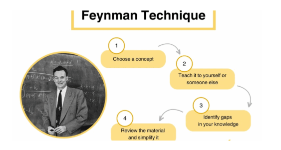 Feynman Technique ဆိုတာ နားလည်ထားတဲ့အရာကို ရိုးရှင်းတဲ့စကားလုံးတွေနဲ့ ပြန်ရှင်းပြခြင်း ဖြစ်ပါတယ်။ ကိုယ်ရှင်းပြနိုင်မယ်ဆိုရင် အဲ့ဒီ သင်ခန်းစာကို တကယ်နားလည်နေပြီဆိုတဲ့ အဓိပ္ပါယ်ပါ။ ဥပမာတွေပါ ပေးပြီး ရှင်းပြနိုင်ပြီဆိုရင်တော့ နောက်ပိုင်းမှာ စာမေ့တာမျိုး မဖြစ်တော့ပါဘူး။ ကိုယ်ရှင်းပြတာတွေမှာ နားမလည်တာ၊ ကမောက်ကမဖြစ်နေတာတွေက Learning gap ဖြစ်တာကြောင့် ပြန်လေ့လာရပါမယ်။ ဒီနည်းလမ်းက အရမ်းအကျိုးရှိပြီး စွဲစွဲမြဲမြဲ မှတ်မိစေမယ့် နည်းလမ်းလေးဖြစ်ပါတယ်။