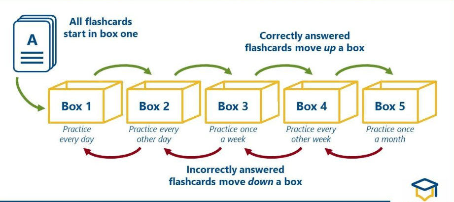 ဥပမာ - Vocab အများကြီး ကျက်တယ်ဆိုပါစို့။ Flashcard ကို တစ်ဖက်မှာ စကားလုံးရေးပြီး တစ်ဖက်မှာ သူ့အဓိပ္ပါယ် ရေးထားပါ။ Box တွေကို ပုံထဲကလို စာပြန်ကြည့်မယ်အချိန် သတ်မှတ်ပြီး ခွဲထားပါ။ Flashcard တွေအားလုံး Box 1 ထဲထည့်ပြီး နေ့စဉ် လေ့လာပါ။ ကိုယ်မှတ်မိသွားတာတွေကို Box 2 ထဲရွှေ့ပါ။ အဲ့လို တစ်ဆင့်ချင်းသွားရင်း Box 5 အထိ တစ်လနေမှ တစ်ခါပဲ ပြန်လေ့ကျင့်တာမျိုး လုပ်ပါ။ မမှတ်မိသေးတဲ့စကားလုံးတွေကတော့ Box 1 ထဲမှာ ဆက်ရှိနေမှာဖြစ်ပြီး နေ့တိုင်း လေ့လာနေရပါမယ်။