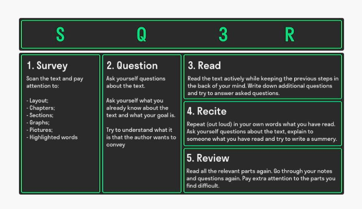 SQ3R ဆိုတာ Survey၊ Question၊ Read၊ Recite နဲ့ Review ဆိုတဲ့ အဆင့် (၅) ဆင့်ပါဝင်တဲ့ စာကျက်နည်းတစ်ခု ဖြစ်ပါတယ်။ စာကို တစ်ခါတည်း မဖတ်ဘဲ အရင် Overview ကြည့်ပြီး ဒီသင်ခန်းစာက ဘာအကြောင်းလဲ၊ ဒီသင်ခန်းစာနဲ့ပတ်သက်ပြီး ဘာတွေသိထားလဲဆိုတာ အရင် မေးခွန်းထုတ်ပါ။ နောက်မှ စာသေချာဖတ်ကြည့်ပြီး ကိုယ်နားလည်သလို Note တွေ မှတ်ထားပါ။ Chapter တစ်ခုလုံး နားလည်သွားပြီဆိုရင် မေးခွန်းတွေ ဖြေကြည့်တာ၊ အဓိကအကြောင်းအရာတွေကို ပြန်ကြည့်တာမျိုး လုပ်ပါ။ ဒီနည်းလမ်းဟာ Textbook Study အတွက် အထူး အသုံးဝင်ပါတယ်။
