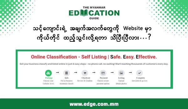 Myanmar Education Guide Website ထဲမှာ သင့်လုပ်ငန်းနဲ့ ပတ်သက်တဲ့ ဖုန်းနံပါတ်၊ လိပ်စာနဲ့ သက်ဆိုင်ရာ အချက်အလက်တွေကို ဖော်ပြပေးမယ့် Listing Service တစ်ခု ရှိပါတယ်။ အဲ့ဒီမှာ Economy Class ၊ Business Class နဲ့ First Class ဆိုတဲ့ Classification Package (၃) မျိုးထဲက တစ်ခု ရွေးချယ်ပြီး Self Listing လုပ်လို့ရမှာ ဖြစ်ပါတယ်။