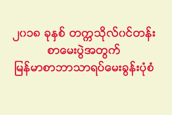 ျမန္မာစာေမးခြန္းဟာ (၃) နာရီ ေမးခြန္းျဖစ္ၿပီး ေမးခြန္း (၆) ပုဒ္ ေျဖဆုိရမွာ ျဖစ္ပါသည္။