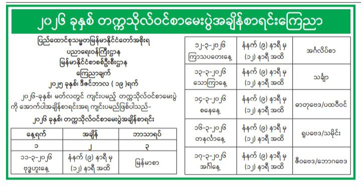 ၂၀၂၆ ခုနှစ်၊ မတ်လတွင် ကျင်းပမည့် တက္ကသိုလ်ဝင်စာမေးပွဲအတွက် အချိန်စာရင်းကို ဒီဇင်ဘာလ (၁၉) ရက်နေ့တွင် မြန်မာနိုင်ငံစာစစ်ဦးစီးဌာနမှ နိုင်ငံပိုင်သတင်းစာများတွင် အသိပေး ထုတ်ပြန်လိုက်သည်။