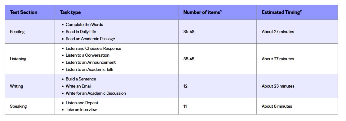 အရင်တုန်းကအတိုင်းပဲ TOEFL မှာ Reading၊ Writing၊ Speaking နဲ့ Listening ဆိုပြီး ဘာသာစကားစွမ်းရည် (၄) မျိုးကို ဖြေဆိုရမှာ ဖြစ်ပါတယ်။ အပိုင်းတစ်ပိုင်းစီမှာ ဖြေဆိုရမယ့် မေးခွန်းအရေအတွက်က အနည်းငယ် ပိုများလာတာ တွေ့ရပြီး ဖြေဆိုချိန်ကတော့ အရင်ကထက် နည်းသွားပါတယ်။ အရင်တုန်းက စာမေးပွဲဖြေဆိုချိန် (၂) နာရီကနေ အခုက (၁) နာရီခွဲပဲ ရှိပြီး အသေးစိတ်ကို အောက်ပါ ဇယားမှာ ကြည့်ရှုနိုင်ပါတယ်။