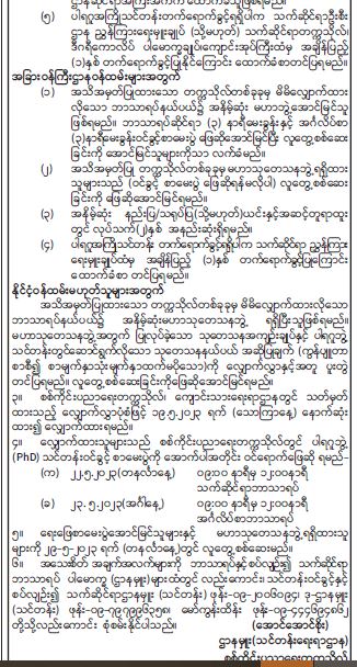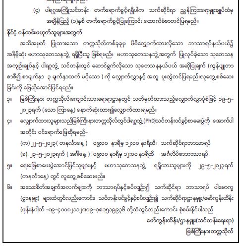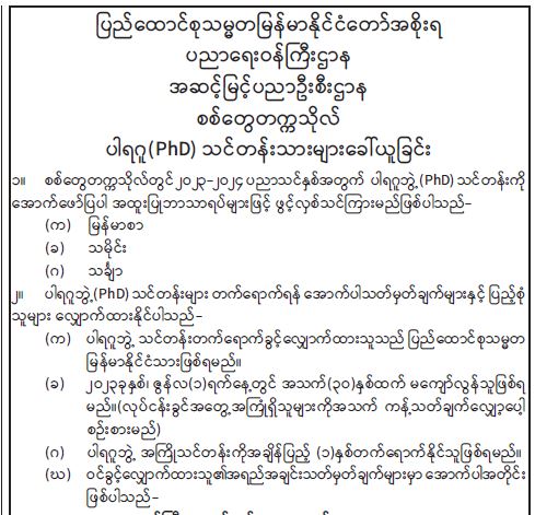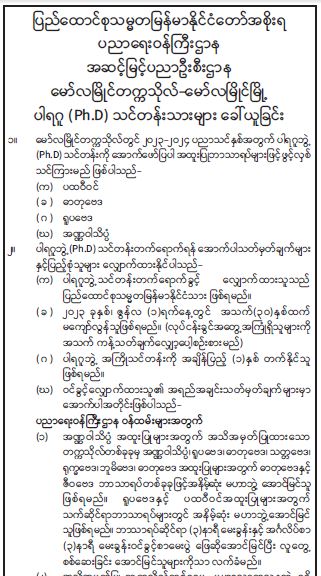 ပညာရေးဝန်ကြီးဌာန၊ အဆင့်မြင့်ပညာဦးစီးဌာနလက်အောက်ရှိ တိုင်းနှင့်ပြည်နယ် (၁၄)ခုအသီးသီး၏အောက်ဖော်ပြပါ တက္ကသိုလ်များမှ ပါရဂူဘွဲ့ (Ph.D) အတွက် သင်တန်းသားများ ခေါ်ယူနေကြောင်းသိရှိရသည်။