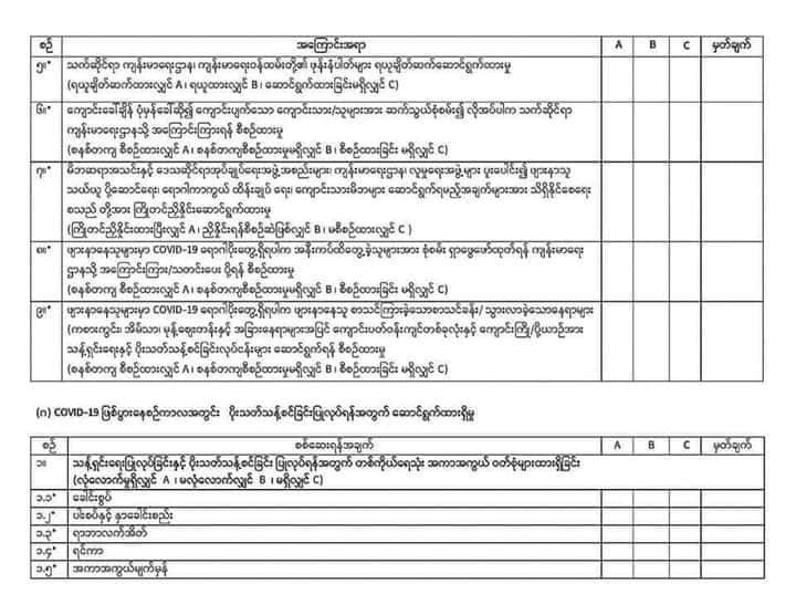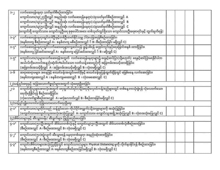 သို့ဖြစ်ပါ၍ ကျောင်းအုပ်ကြီးများ / တာဝန်ခံကျောင်းအုပ်များသည် မိမိတို့ကျောင်းများကို ကျန်းမာရေးနှင့် အားကစားဝန်ကြီးဌာန၏ ယခင်ညွှန်ကြားချက်များနှင့် အညီ ( အချက် ၈၀ ပါ ) ကြိုတင်ပြင်ဆင်ဆောင်ရွက်ထားရမည် ဖြစ်ပြီး ပညာရေးဝန်ကြီးဌာနမှ ညွှန်ကြားသည့် (A,B,C) အဆင့်များအနက် (A)အဆင့်ရရှိမှသာ ကျောင်းဖွင့်လှစ် ရရှိမည်ဖြစ်သဖြင့် ကျောင်းဖွင့်နိုင်ရေးအတွက် ယနေ့မှစ၍ ကြိုတင်ပြင်ဆင်ထားရန် ထပ်ဆင့် အသိပေးထားခြင်းဖြစ်ပါသည်။