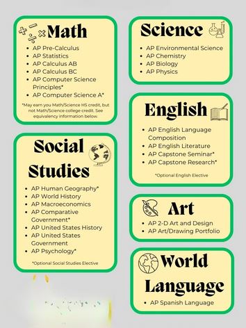 AP မှာ အင်္ဂလိပ်၊ သင်္ချာနှင့် ကွန်ပျူတာသိပ္ပံ၊ သမိုင်းနှင့် လူမှုသိပ္ပံ၊ သိပ္ပံ၊ ဘာသာစကားနှင့် ယဉ်ကျေးမှုဆိုပြီး ဘာသာရပ်တွေ များစွာ ရှိပါတယ်။ ဒီထဲကမှ ကိုယ်ရွေးချယ်ထားတဲ့ Course အလိုက် ကောလိပ် (သို့) တက္ကသိုလ်မှာ Credit Transfer လုပ်ပြီး တက်ရောက်နိုင်ပါတယ်။