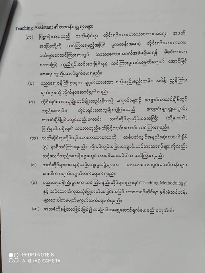 ပညာေရးဝန္ႀကီး ဌာန၊ အေျခခံပညာေက်ာင္းမ်ားတြင္ တိုင္းရင္းသားဘာသာစာေပသင္ၾကားမည့္ ေန႔စားလေပး ဆရာ/ဆရာမမ်ား (Teaching Assistant) ရာထူးကို ေအာက္ေဖာ္ျပပါသတ္မွတ္အရည္အခ်င္းမ်ားႏွင့္ ျပည့္စံုသူမ်ား ေလ်ွာက္ထားႏိုင္ပါတယ္။