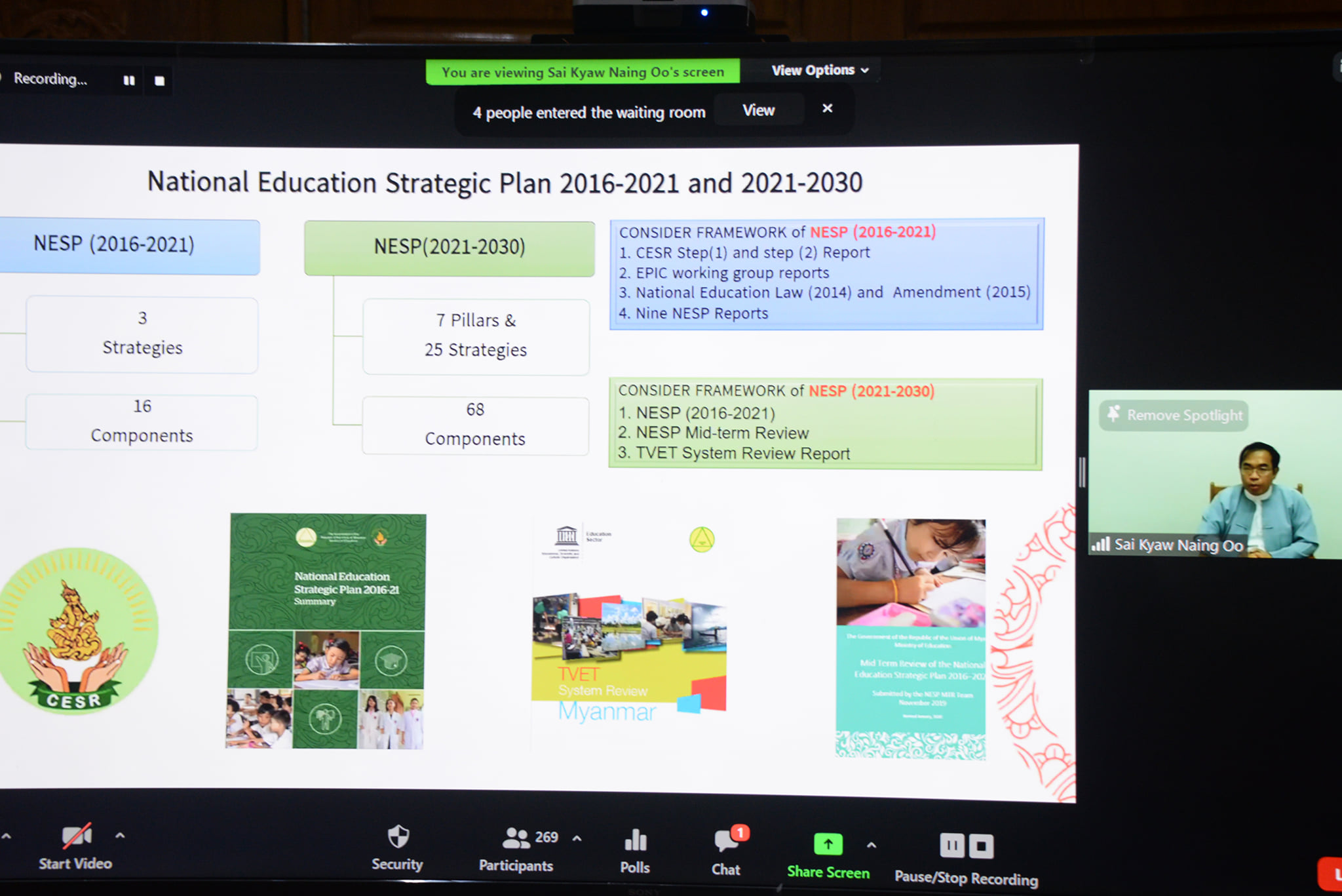 ထို့နောက် ပညာရေးဝန်ကြီးဌာန အမြဲတမ်းအတွင်းဝန် ဒေါက်တာဇော်မြင့်က အမျိုးသား ပညာရေးမဟာဗျူဟာစီမံကိန်း (၂၀၂၁-၂၀၃၀) ရေးဆွဲခြင်းလုပ်ငန်းကို မိတ်ဆက်ရှင်းလင်းကာ UNESCO IIEP က ဆောင်ရွက်ထားသော ပညာရေးကဏ္ဍလေ့လာသုံးသပ်ချက် (Education Sector Analysis – ESA)အစီရင်ခံစာကို ဆက်လက်ရှင်းလင်းဆွေးနွေးပါသည်။ ဆက်လက်၍ ညွှန်ကြားရေးမှူးချုပ် ဦးကိုလေးဝင်းက အခြေခံပညာကဏ္ဍနှင့် ညွှန်ကြားရေးမှူးချုပ် ဒေါက်တာစိုင်းကျော်နိုင်ဦးက နည်းပညာနှင့်သက်မွေးပညာကဏ္ဍတို့ကို ရှင်းလင်းဆွေးနွေးကြ ပါသည်။