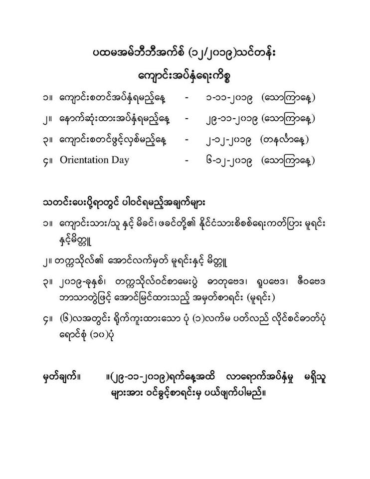 ပထမ အမ်ဘီဘီအက်စ်(၁၂/၂၀၁၉) သင်တန်း ကျောင်းအပ်နှံရေး