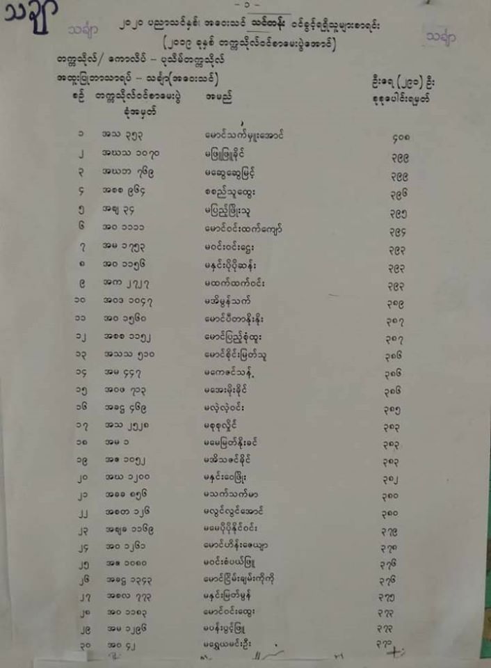 ၂၀၂၀ ခုနှစ် - တက္ကသိုလ်ဝင် စာမေးပွဲအောင်စာရင်း (ရန်ကုန်တိုင်းဒေသကြီး)