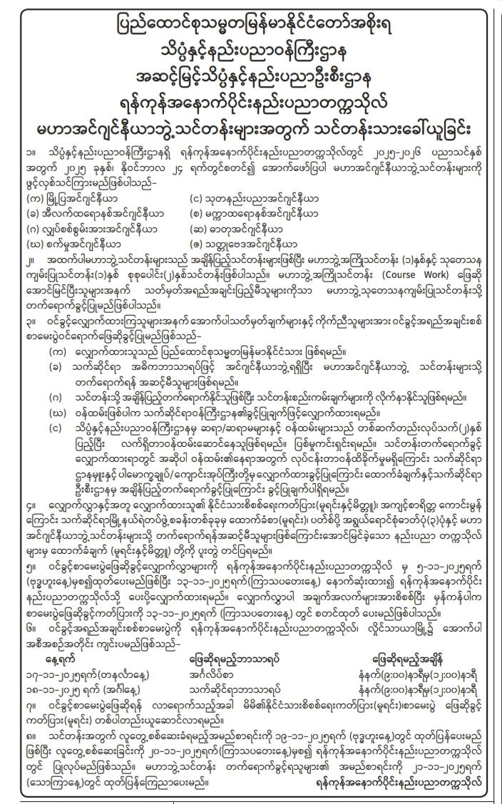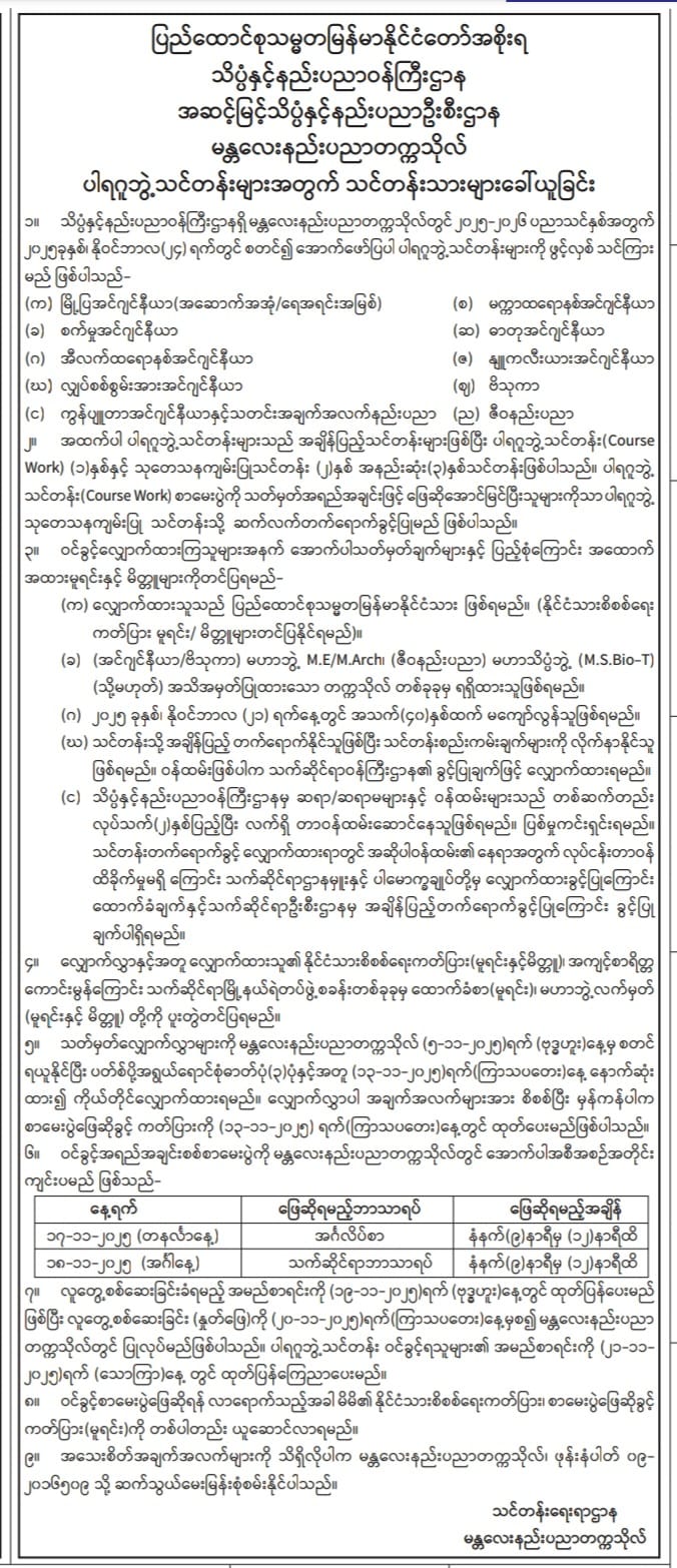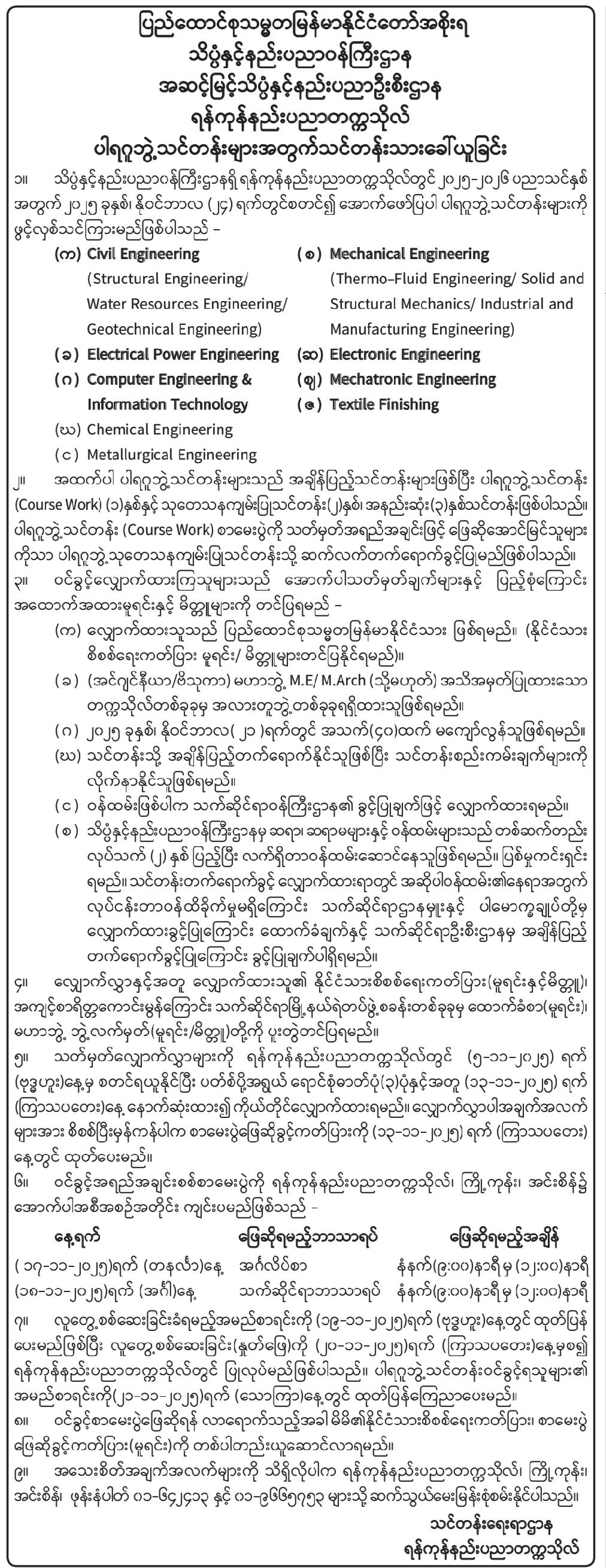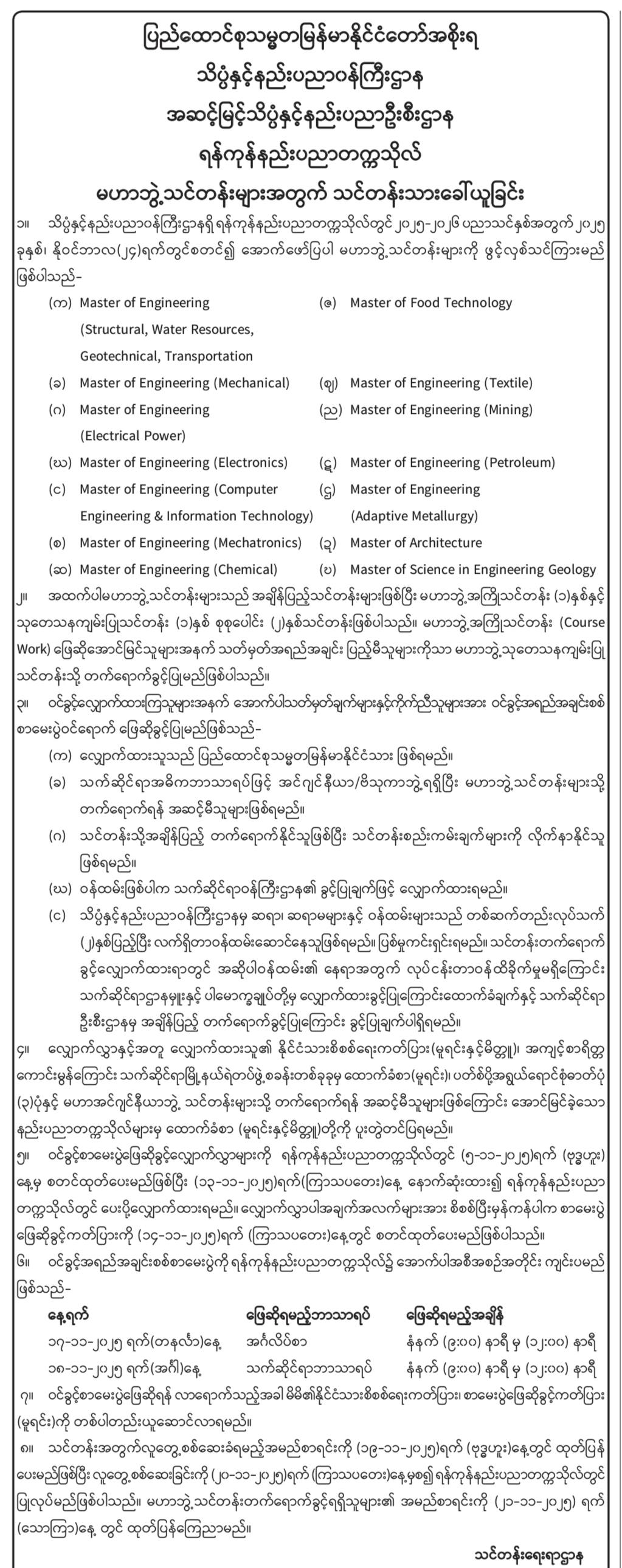 အောက်ဖော်ပြပါ နည်းပညာနှင့် ကွန်ပျူတာတက္ကသိုလ် (၁၅) ခုတို့တွင် အင်ဂျင်နီယာနှင့် နည်းပညာဆိုင်ရာ ဘွဲ့လွန်ဒီပလိုမာသင်တန်းများ၊ မဟာဘွဲ့သင်တန်းများနှင့် ပါရဂူဘွဲ့သင်တန်းများကို နိုဝင်ဘာလ (၂၄) ရက်နေ့တွင် ဖွင့်လှစ်သွားပါမည်။