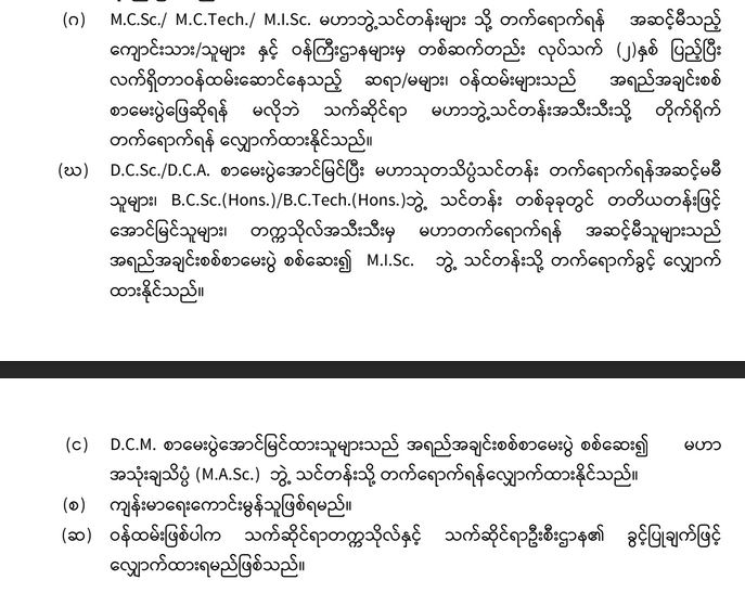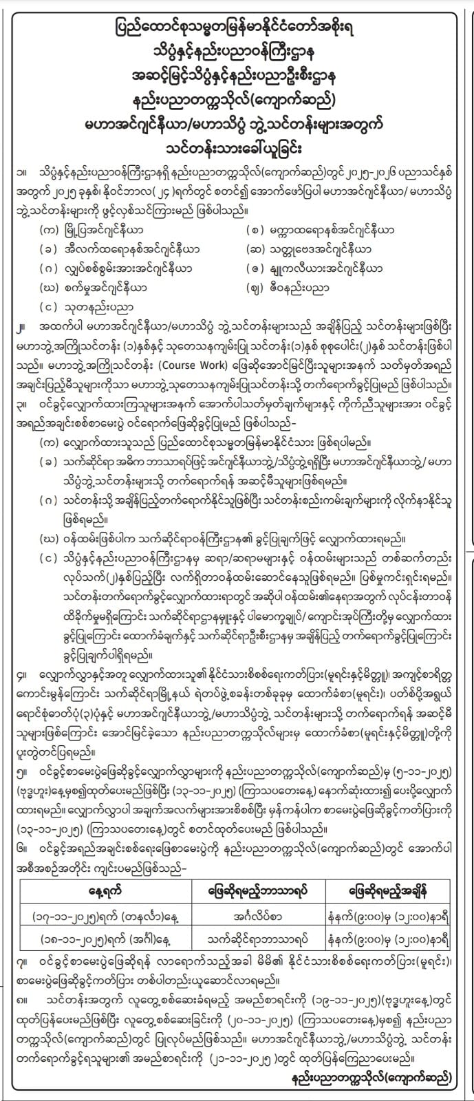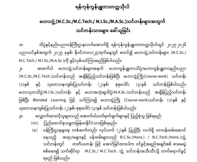 နည်းပညာတက္ကသိုလ် (သန်လျင်)၊ ရန်ကုန်ကွန်ပျူတာတက္ကသိုလ်၊ နည်းပညာတက္ကသိုလ် (မန္တလေး)၊ နည်းပညာတက္ကသိုလ် (ကျောက်ဆည်) နှင့် နည်းပညာတက္ကသိုလ် (တောင်ကြီး) တို့တွင် အင်ဂျင်နီယာနှင့် နည်းပညာဆိုင်ရာ မဟာဘွဲ့သင်တန်းများနှင့် ပါရဂူဘွဲ့သင်တန်းများကို နိုဝင်ဘာလ (၂၄) ရက်နေ့တွင် ဖွင့်လှစ်သွားပါမည်။