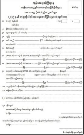- ၎င်းဒေသရှိ ကျောင်း၌ (၃)နှစ်ဆက်တိုက် တက်ရောက်ခဲ့သူဖြစ်ကြောင်းနှင့် တက္ကသိုလ်ဝင် စာမေးပွဲကို STEAMS-1 ဘာသာတွဲဖြင့် ၎င်းဒေသရှိစာစစ်ဌာနမှ အောင်မြင်သူဖြစ်ကြောင်း သက်ဆိုင်ရာ အခြေခံ ပညာအထက်တန်းကျောင်း၊ ကျောင်းအုပ်ကြီး၏ ထောက်ခံချက်နှင့် မြို့နယ်ပညာရေးမှူးတို့၏ ထောက်ခံချက် (မူရင်း)