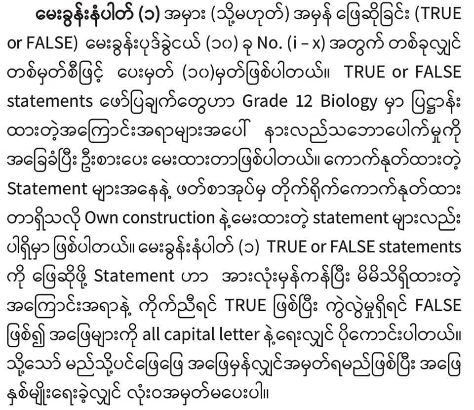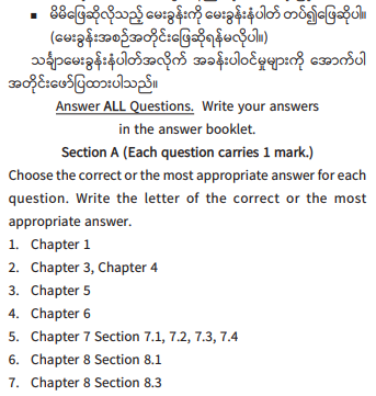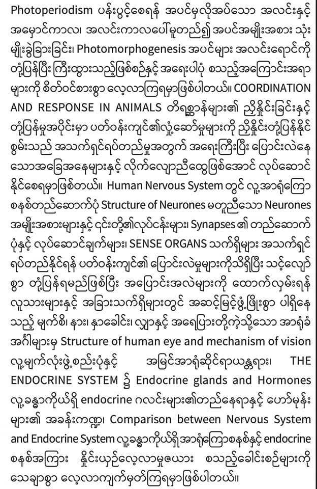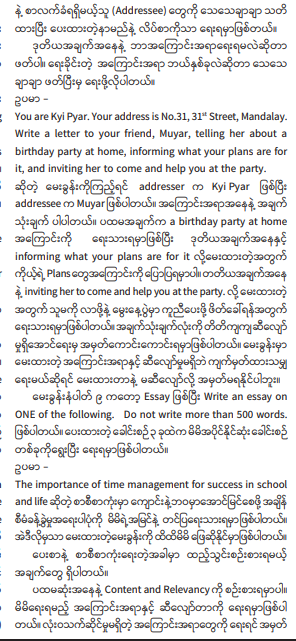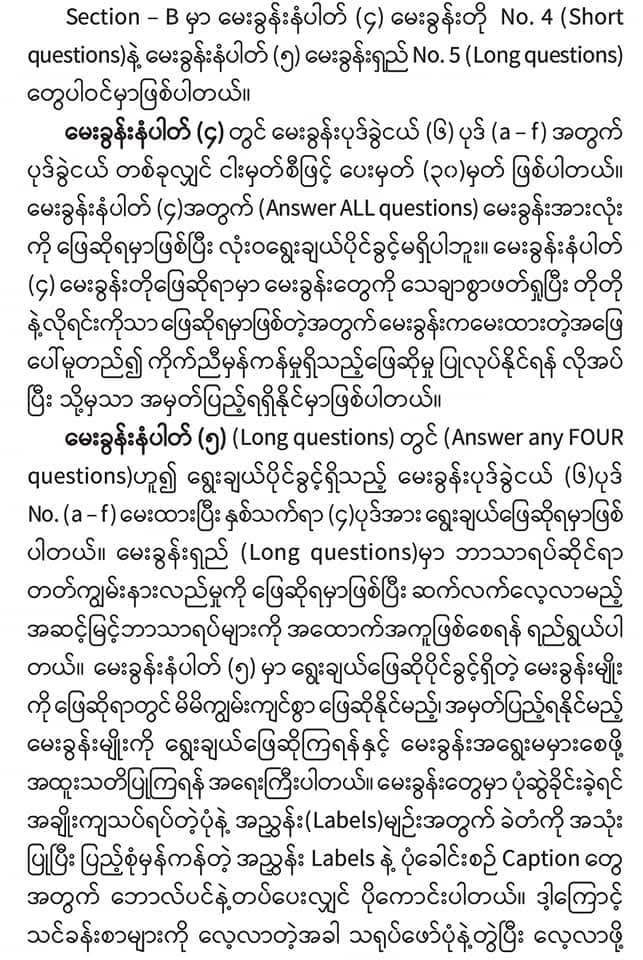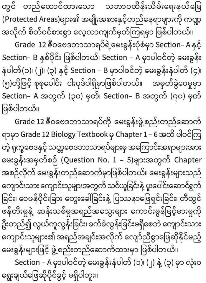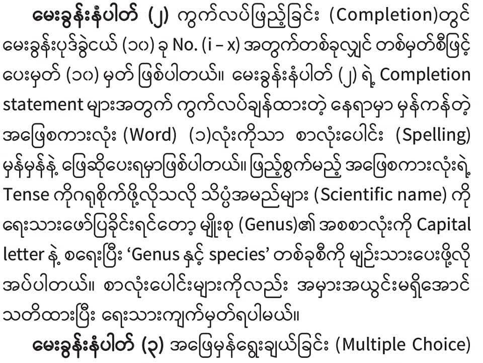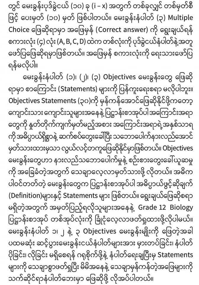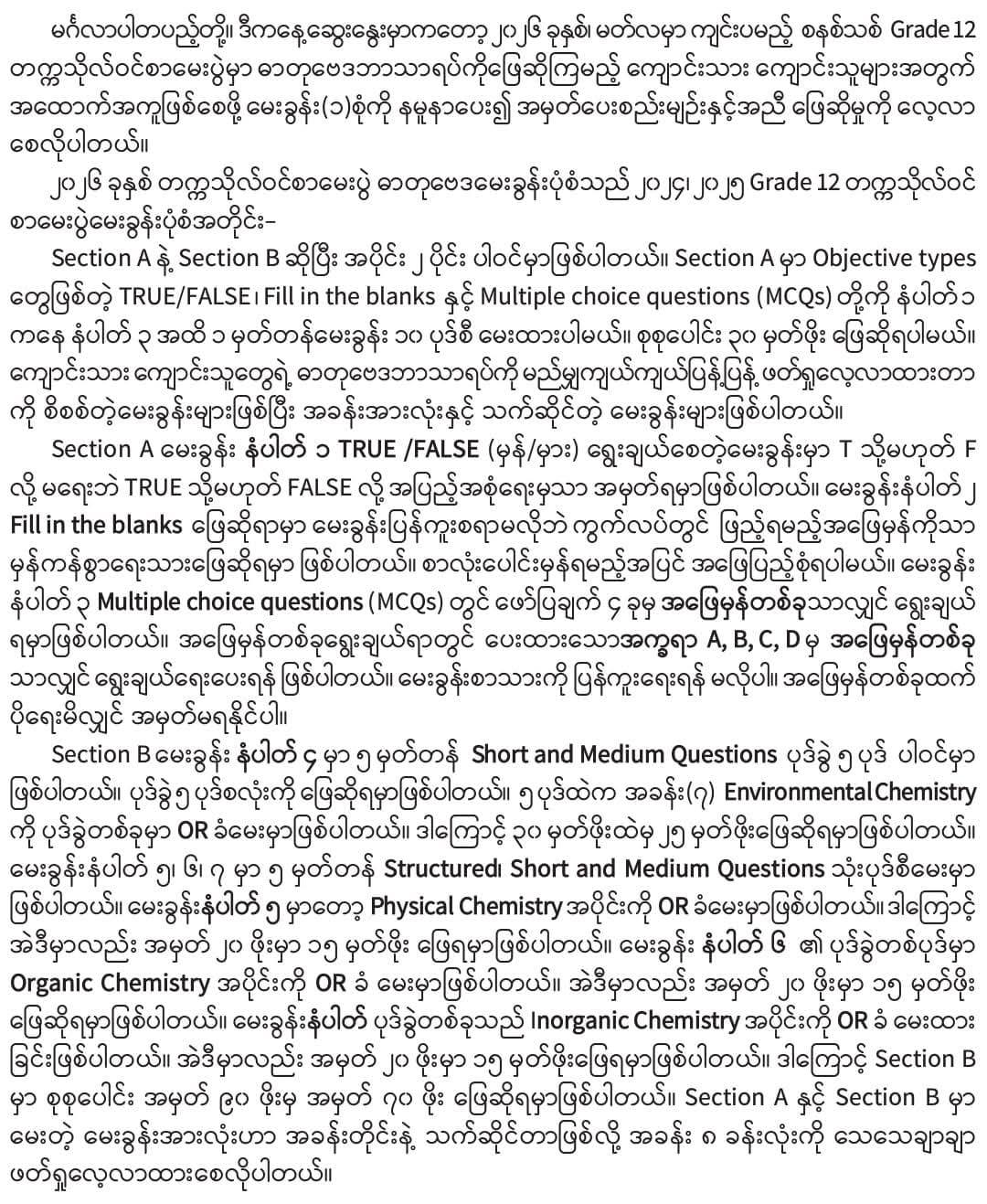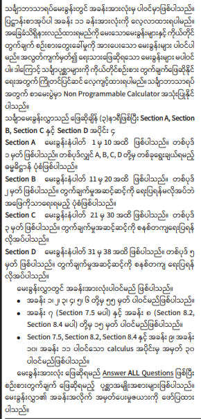 ယခုဖော်ပြချက်သည် ၂၀၂၆ ခုနှစ်၊ မတ်လတွင် ကျင်းပမည့် တက္ကသိုလ်ဝင်စာမေးပွဲတွင် ဝင်ရောက်ဖြေဆိုကြမည့် ကျောင်းသား၊ ကျောင်းသူများ သိထားရမည့် ပြဌာန်းစာအုပ်ပါ သင်ခန်းစာအကြောင်းအရာများ၊ မေးခွန်းပုံစံနှင့် အမှတ်ပေးစည်းမျဉ်းများကို ဘာသာရပ်တစ်ခုချင်းစီအလိုက် ဖော်ပြထားခြင်း ဖြစ်သည်။