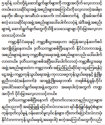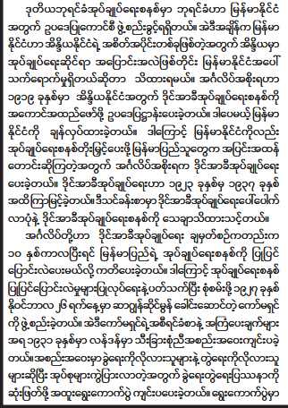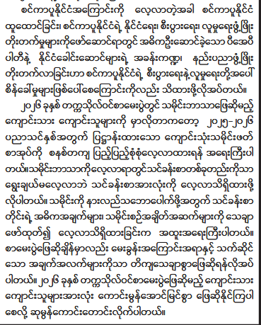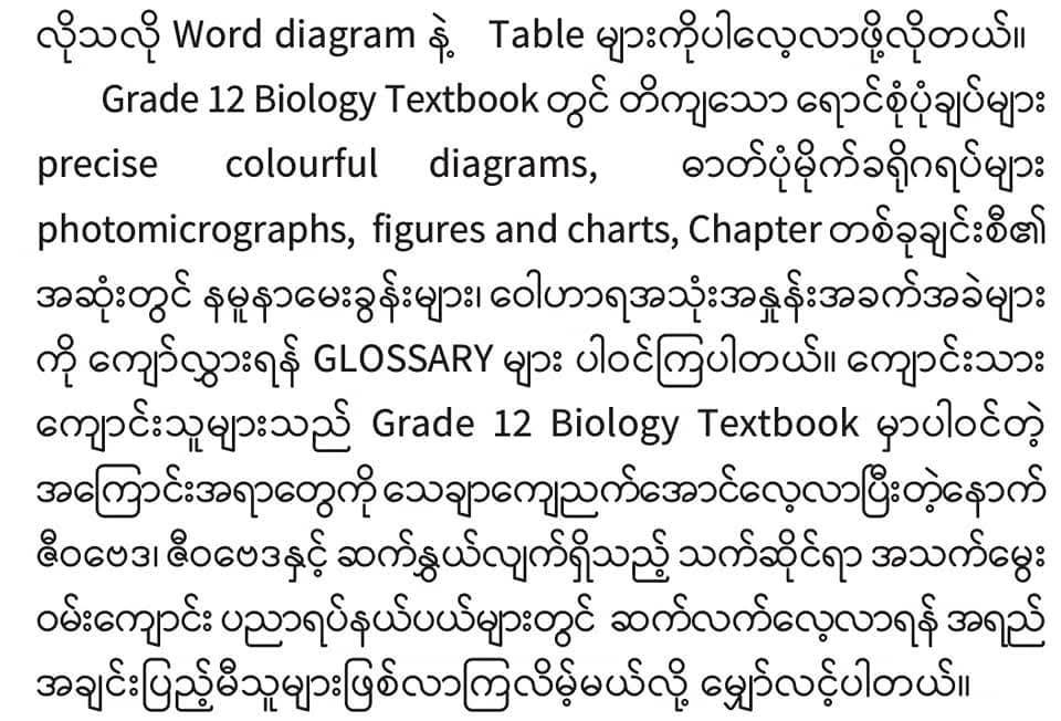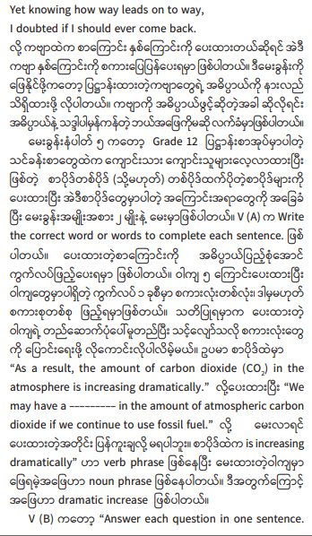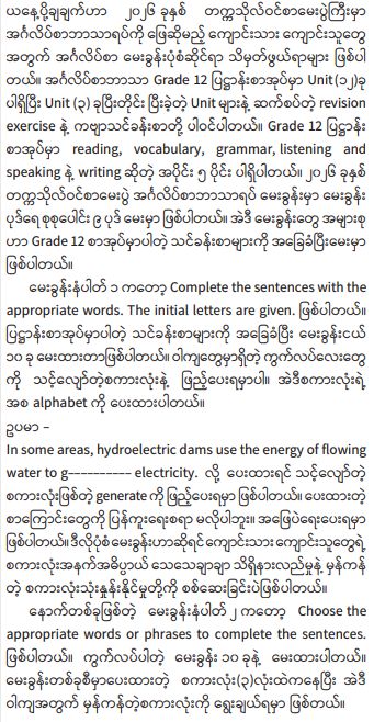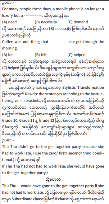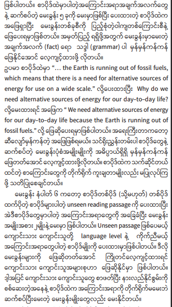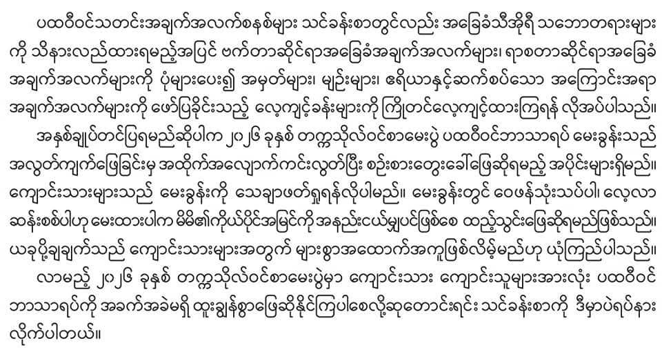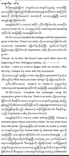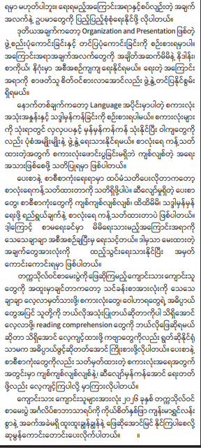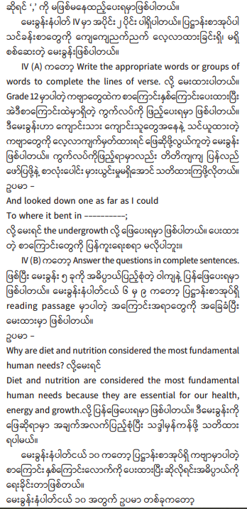 အင်္ဂလိပ်စာ (ဒေါက်တာဖြူဖြူသင်း၊ ပါမောက္ခ(ဌာနမှူး)၊ အင်္ဂလိပ်ဘာသာဌာန၊ ရန်ကုန်နိုင်ငံခြား ဘာသာတက္ကသိုလ်)