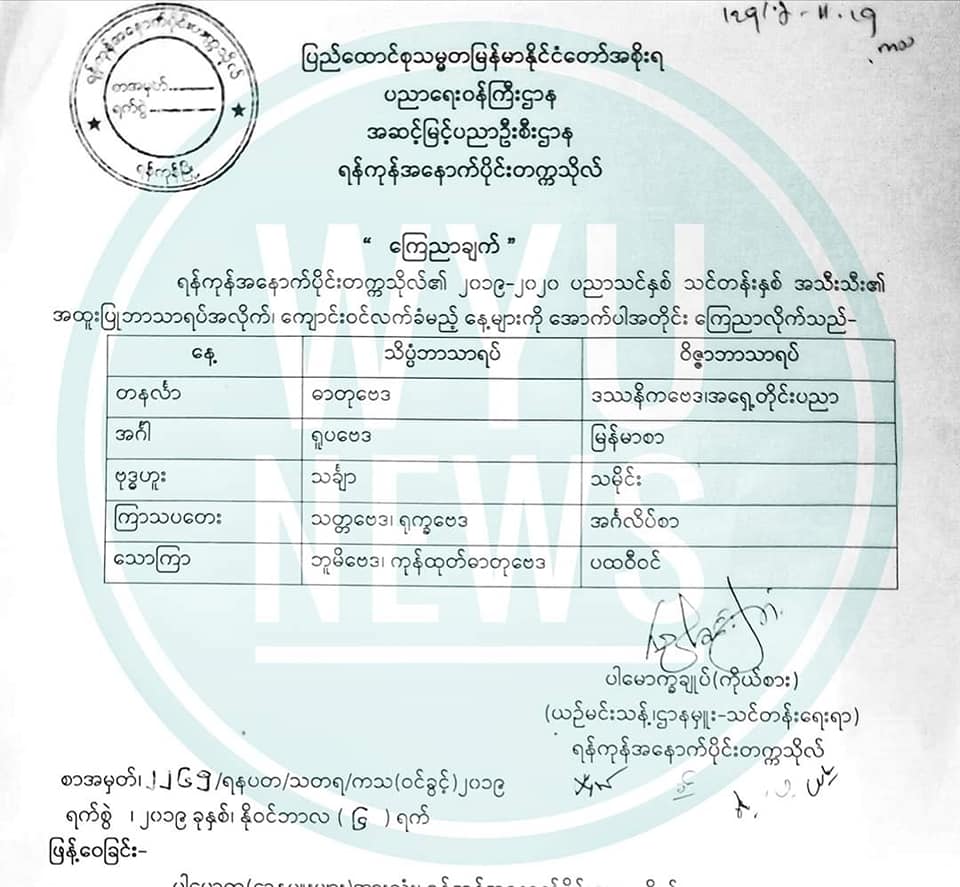 ဒုတိယနှစ် နှင့်အထက် အတန်းကြီးများအား အောင်စာရင်းထွက်ရှိပြီးသည့် နောက်ရက်များမှ စတင်လက်ခံပေးမည် ဖြစ်ကြောင်း....