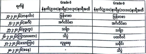 မူလတန်းအဆင့်ပြီးမြောက်စစ်ဆေးခြင်း (Grade 5) စာမေးပွဲနှင့် အလယ်တန်းအဆင့်ပြီးမြောက်စစ်ဆေးခြင်း (Grade 9) စာမေးပွဲတို့ကို ၂၀၂၆ ခုနှစ်၊ ဖေဖော်ဝါရီလ (၂၃) ရက်နေ့မှ စ၍ ဘာသာရပ်အလိုက် ပိတ်ရက်မရှိ ဖြေဆိုရပါမည်။
