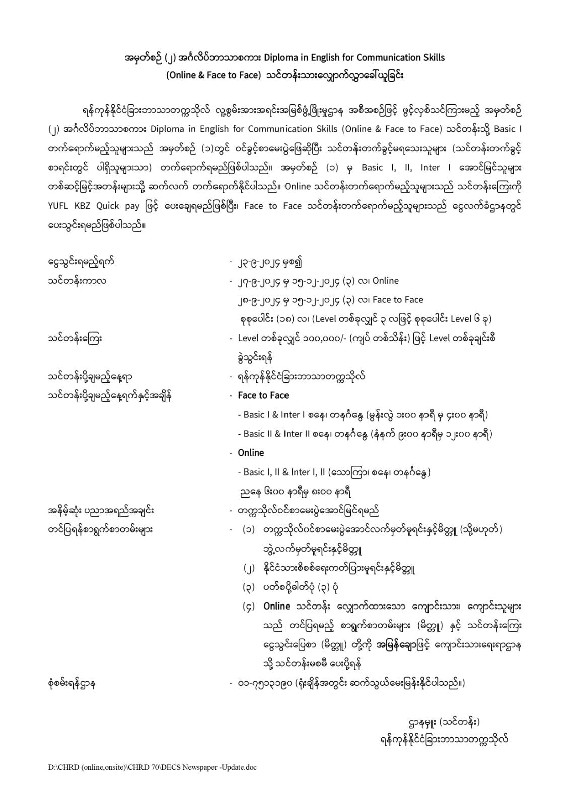 Diploma in English for Communication သင်တန်းကို စတင်တက်ရောက်မည့်သူများအတွက် ယခင်က ဝင်ခွင့်ဖြေဆိုထားပြီး တက်ရောက်ခွင့်မရသေးသူ လူဟောင်းများကိုသာ လက်ခံဝင်ခွင့်ပြုမည်ဖြစ်ကြောင်း တက္ကသိုလ်လူမှုကွန်ရက်စာမျက်နှာတွင် ကြေညာထားပါသည်။
